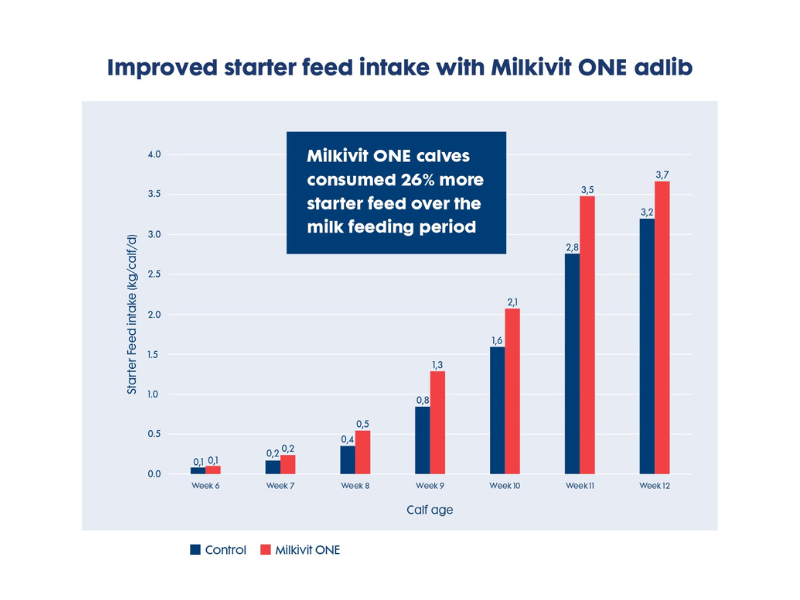 Harnessing the power of mother nature to restore the fatty acid profile in Milkivit ONE brings many advantages to early life performance of calves. One significant benefit is the improvement in rumen and intestinal development, which leads to optimal digestion and increased energy intake from milk and starter feed (Figure 1). This, in turn, supports a smoother weaning transition and promotes optimal growth rates, helping to develop a robust and resilient calf at weaning and beyond.