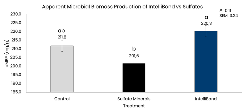 Recent research from Fermentrics Technologies, Inc. demonstrated the superior performance of IntelliBond sources of zinc and manganese in promoting apparent microbial biomass production (aMBP), a key indicator of rumen health and efficiency (Figure 1). Previous studies showed that replacing zinc sulfate with IntelliBond Z at 90 ppm improved volatile fatty acid production from 62mM to 90mM - an essential energy source for dairy cows.