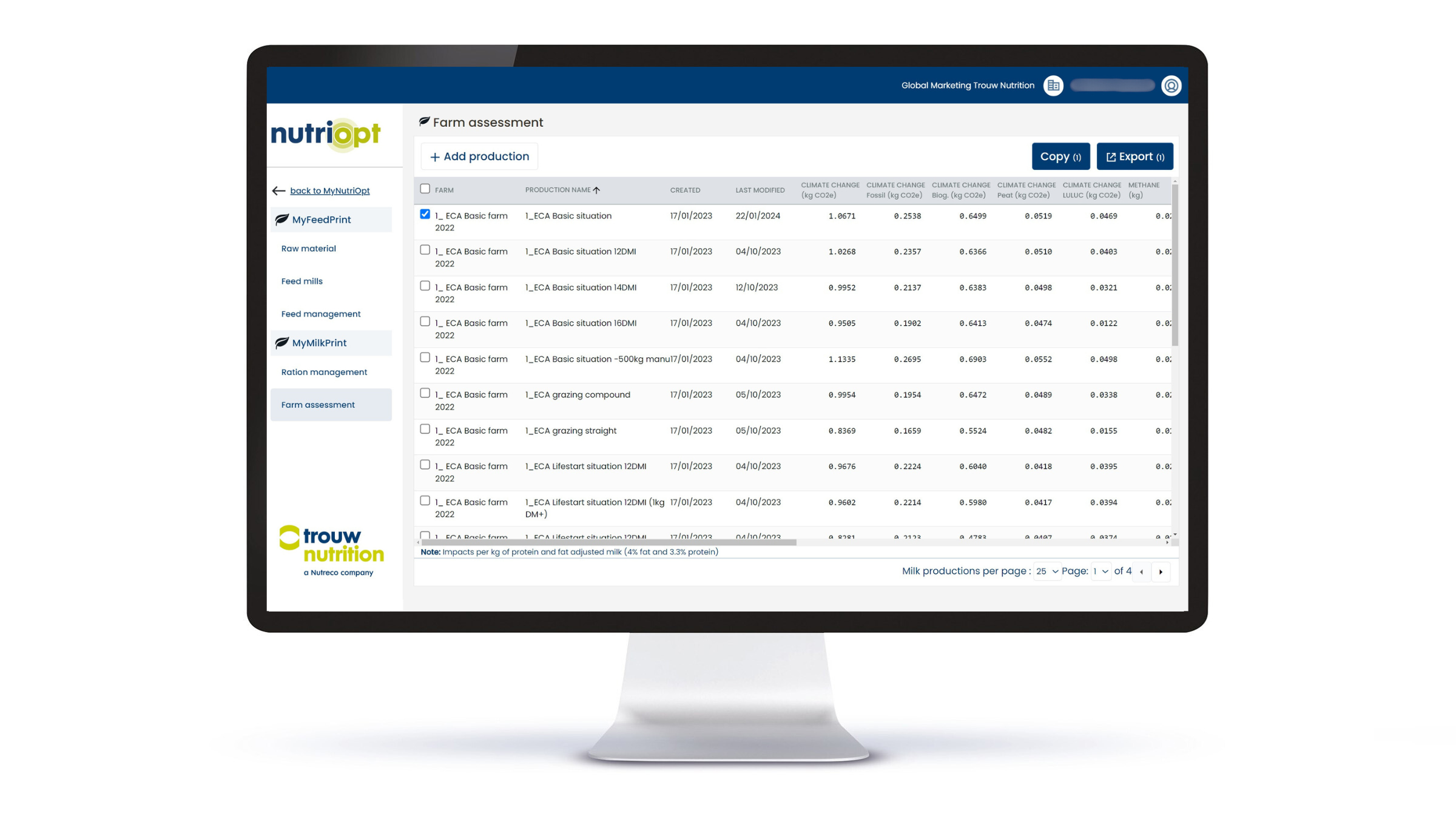 MyMilkPrint is an online life cycle assessment service that allows feed advisors to determine the environmental footprint of their clients' milk production with just a few clicks. Using the wide range of regularly updated data available, advisors can run scenarios and uncover strategies to reduce the environmental footprint of farmers’ dairy production operations. The solution is accessible via the MyNutriOpt platform for simple, one-stop access.