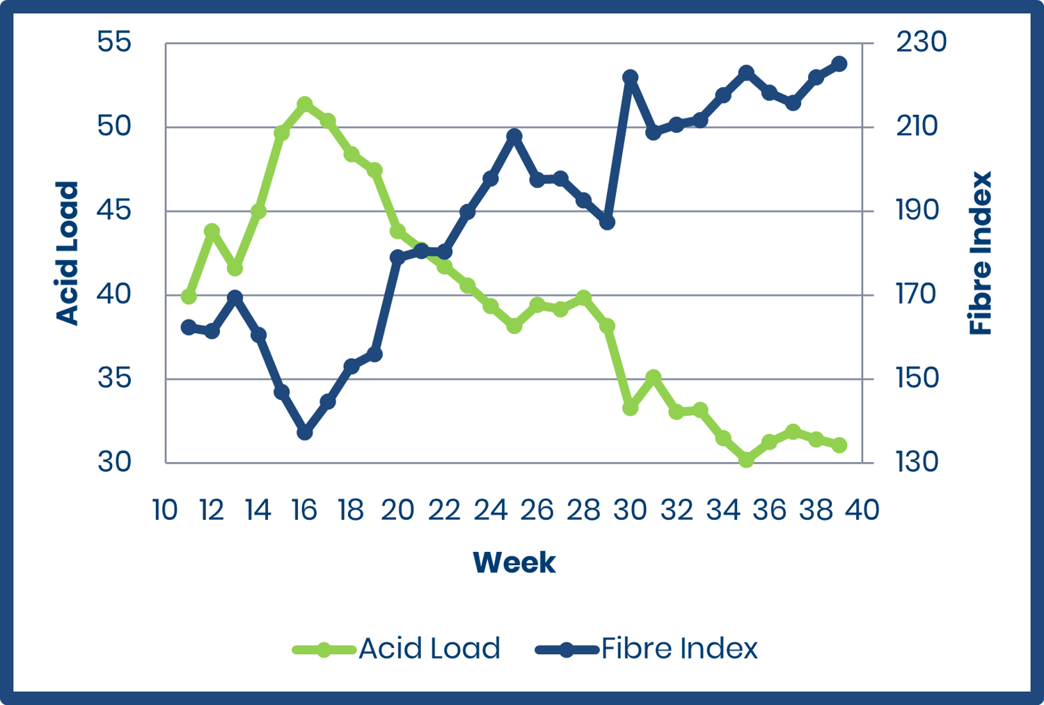 Rumen Health: Good rumen health means keeping a consistent rumen pH, which allows microbes to perform at maximum efficiency. The risk of acidosis increases during early spring because of both a high acid load and low fibre index, while the risk towards the end of the season is lower when acid load falls and fibre index increases (figure one). Rumen Unsaturated Fatty Acid Load (RUFAL) can be used to monitor the risk of decreased butterfat. High RUFAL levels alongside high acid load and low fibre index can increase the risk of decreased butterfat further.