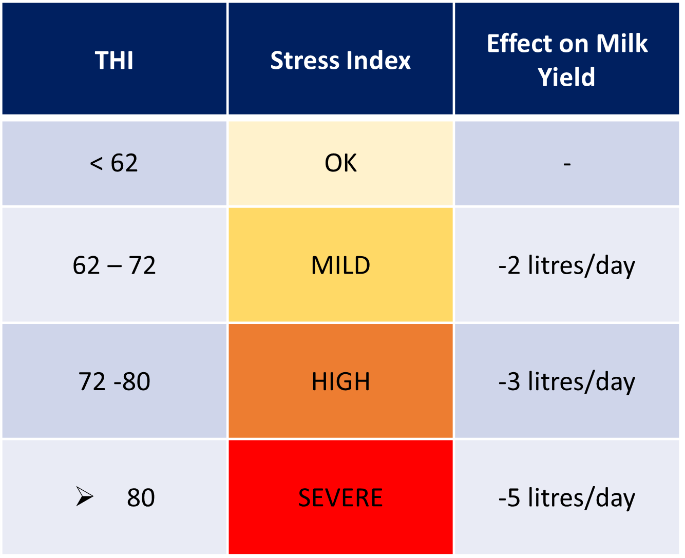The temperature humidity index (THI) uses average daily temperature and humidity values to calculate potential impact on cows throughout the season. As temperature and humidity increase these have adverse effects on behaviour, physiology and production potentially causing reduced DMI, poor conception rates and expression of oestrus and reduced milk yield.