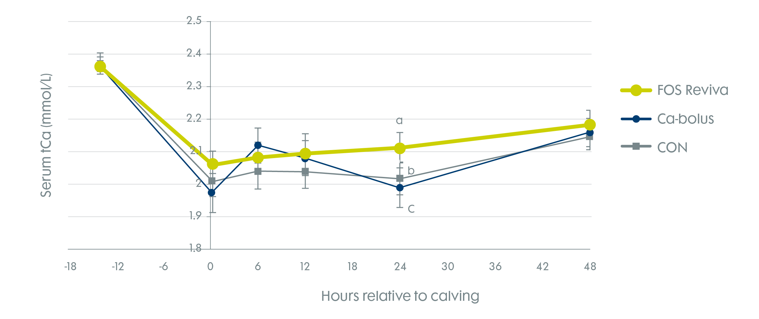 Farm-O-San Reviva is an easily digestible, highly palatable energy drink for cows. It contains the electrolytes, calcium and energy the cow needs to restore energy after calving, in a rapidly metabolisable formulation. It should be given immediately after calving. This energy booster stimulates the cow’s activity, dry matter intake and increases the blood calcium level post calving, which is clearly visible in this graphic. This contributes to a good start of milk production and improves health.