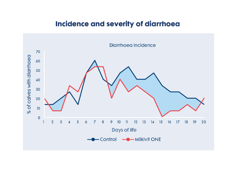 The correct balance of fatty acids in Milkivit ONE supports gastrointestinal tract integrity, which plays an important role in protecting the calves against diarrhoea. Feeding Milkivit ONE leads to a better development of the intestinal tract and has shown to reduce the incidence and severity of diarrhoea in calves (Figure 2). Additionally, calves fed Milkivit ONE were found to have less treatment days and therefore a lower risk of mortality compared to a control group, which was fed Energized Calf Milk.