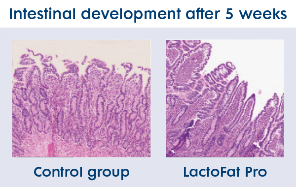 Trials at our research and development centre have shown that the fatty acid profile of Milkivit ONE leads to improved rumen development during the milk feeding phase. Histological research shows that the intestinal structures in calves that were fed Milkivit ONE were more developed, with significantly longer villi length. Additionally, the stronger intestinal development supports a trend for higher fat digestibility in calves.